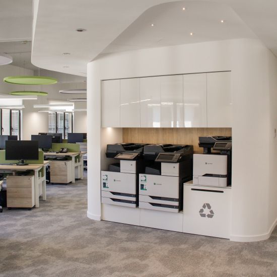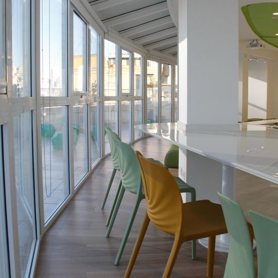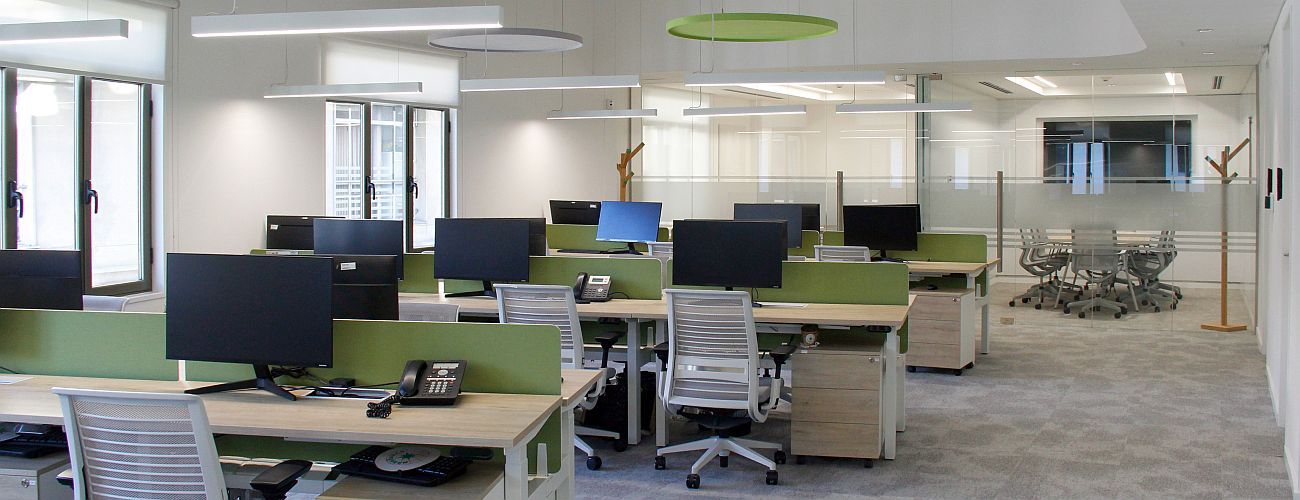 Los pisos de oficina se estructuran a partir de una curva de la fachada original. Bajo el concepto de open space, los puestos operativos se organizan radialmente en espinas, estableciendo un diálogo fluido con la arquitectura preexistente que rompe con la rigidez de los esquemas laborales tradicionales.